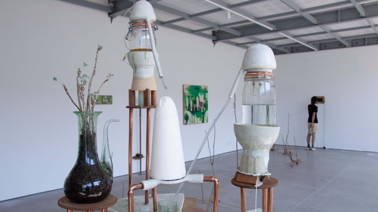 C'est encore une pratique d'échange et de rencontre qui préside à la sculpture La pesanteur et la grâce (2023). Laurence Merle y utilise une plante qui lui sera d'abord plusieurs fois rapportée d'Algérie par des habitant·es de Marseille, puis qu'elle cultivera au Jardin Fruchau : le chiba, utilisé en infusion pour parfumer le thé, et connue en France sous le nom d'absinthe (Artemisia absinthium l.). La sculpture consiste en une fontaine à absinthe sophistiquée dont les alambics, permettant simultanément la distillation et le service en goutte à goutte, sont travaillés à partir de ceux conçu par le céramiste et alchimiste Olivier Zol. L'absinthe, qui désigne à la fois la plante et la boisson alcoolisée qui résulte de sa distillation, est souvent associée à l'alchimie en raison de ses effets psychoactifs qui altèrent tant le corps que l'esprit, se rapprochant des recherches alchimiques sur la transmutation des matériaux et de l'âme. Ce travail s'inscrit dans un intérêt plus large de Laurence Merle pour l'accès à la connaissance par l'expérience et la subjectivité, ainsi que pour les mythologies populaires, auxquelles elle choisit ici d'accéder par l'intermédiaire du monde végétal. L'absinthe est depuis longtemps un symbole d'un processus magique d'exploration des perceptions, d'où son surnom populaire de « fée verte », en référence à son vert lumineux.
