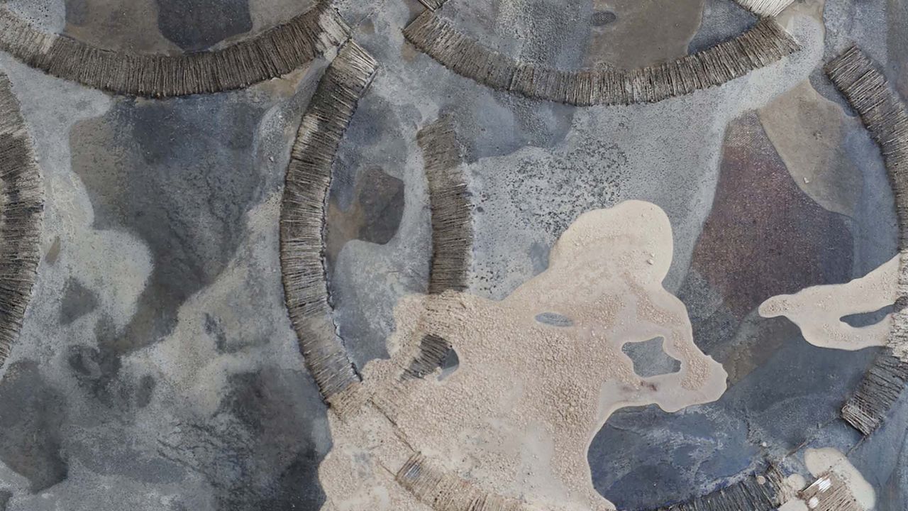 Délayés, le bleu s'écoule, le noir goutte, le brun se délave. Les couleurs sont juteuses, les pigments noyés. On ne sait pas bien si l'on fait face à un ciel d'orage ou à une mare de boue, à des cumulonimbus essorés après la pluie ou à une flaque asséchée. Le jour, dans l'atelier, l'artiste brode les toiles soigneusement. Des motifs apparaissent ; là des cercles encastrés, ici des petits carreaux successifs. Le soir, les couleurs sont projetées, parfois égouttées, parfois doucement déposées en mousse mélangées à du savon ; la toile peut-être irriguée, l'eau essuyée, selon si l'on pense à la mer qui se retire, à la pluie qui tombe ou à la raclette qui nettoie le sol. Le lendemain, Cassandra Naigre découvre comment les pigments se sont cristallisés durant la nuit. Et iel recommence, ajoute des strates à celles de la veille, faisant ainsi apparaître les Latences insulaires (2024-2025).
